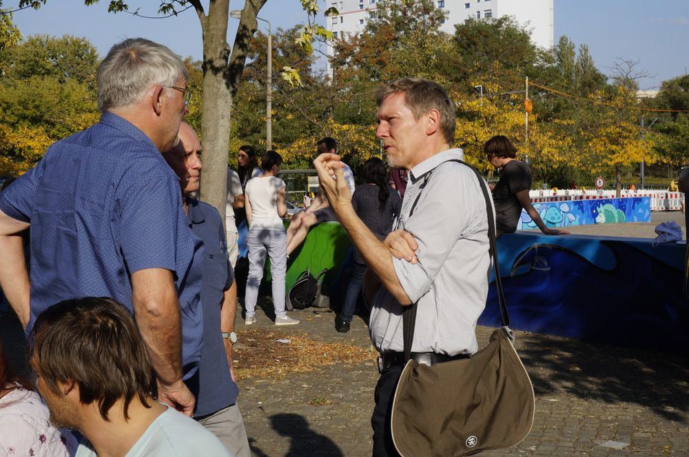Kalle Krott (li.), fachlicher Leiter von ZIK, erläuterte Kolleg*innen und Gästen die Besonderheiten der Arbeit in Marzahn.